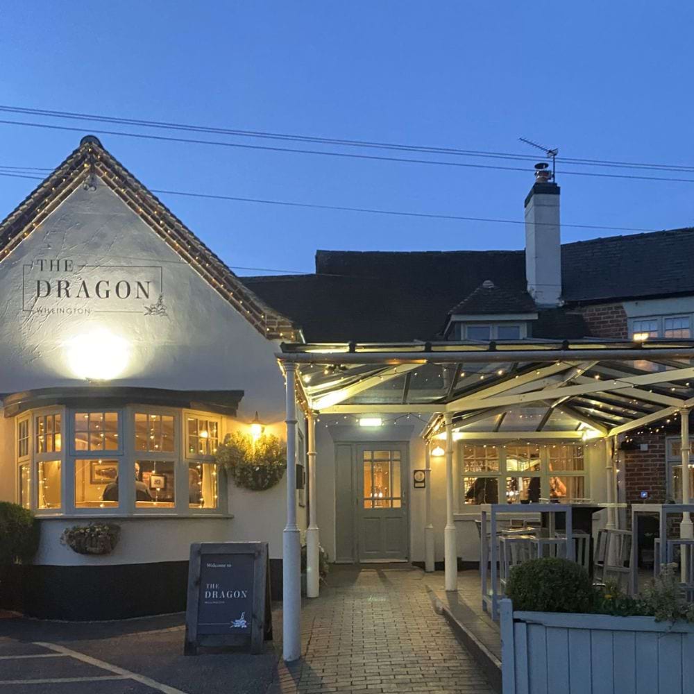 The Dragon Willington is a beautifully renovated traditional country pub, part of the Bespoke Inns group, with a character-filled atmosphere and scenic views backing onto the Trent and Mersey canal. It boasts a large 70-seater restaurant, snug, extensive bar area, beautiful conservatory, seven luxury guest rooms, and a fabulous beer garden with outdoor all-weather dining. The pub is famed for its community events, themed evenings, and a varied menu created by top chefs.