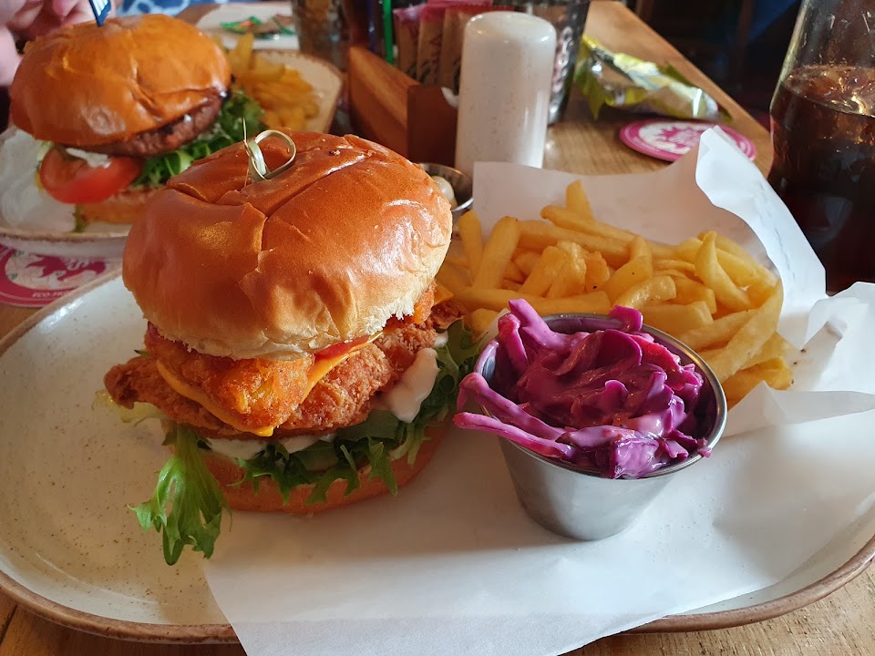 The Red Lion serves traditional pub food including juicy burgers, hearty pies, curries, and Sunday roasts, with a reputation for good portions and great value.